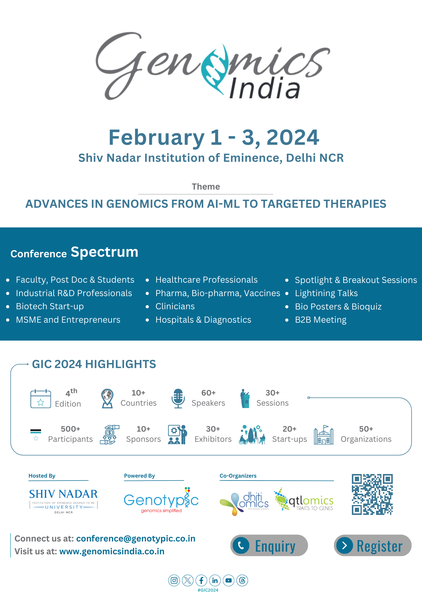 Join us at the Genomics India Conference 2024: Shiv Nadar Institution of Eminence, Delhi NCR from February 1st – 3rd 2024, to gain new insights into the latest advances in genomics from AI-ML to targeted therapies from our world-renowned speakers. You’ll also have the opportunity to participate in our satellite workshop on NGS Analytics and Genome Informatics, and of course network with other members of the genomics Community.