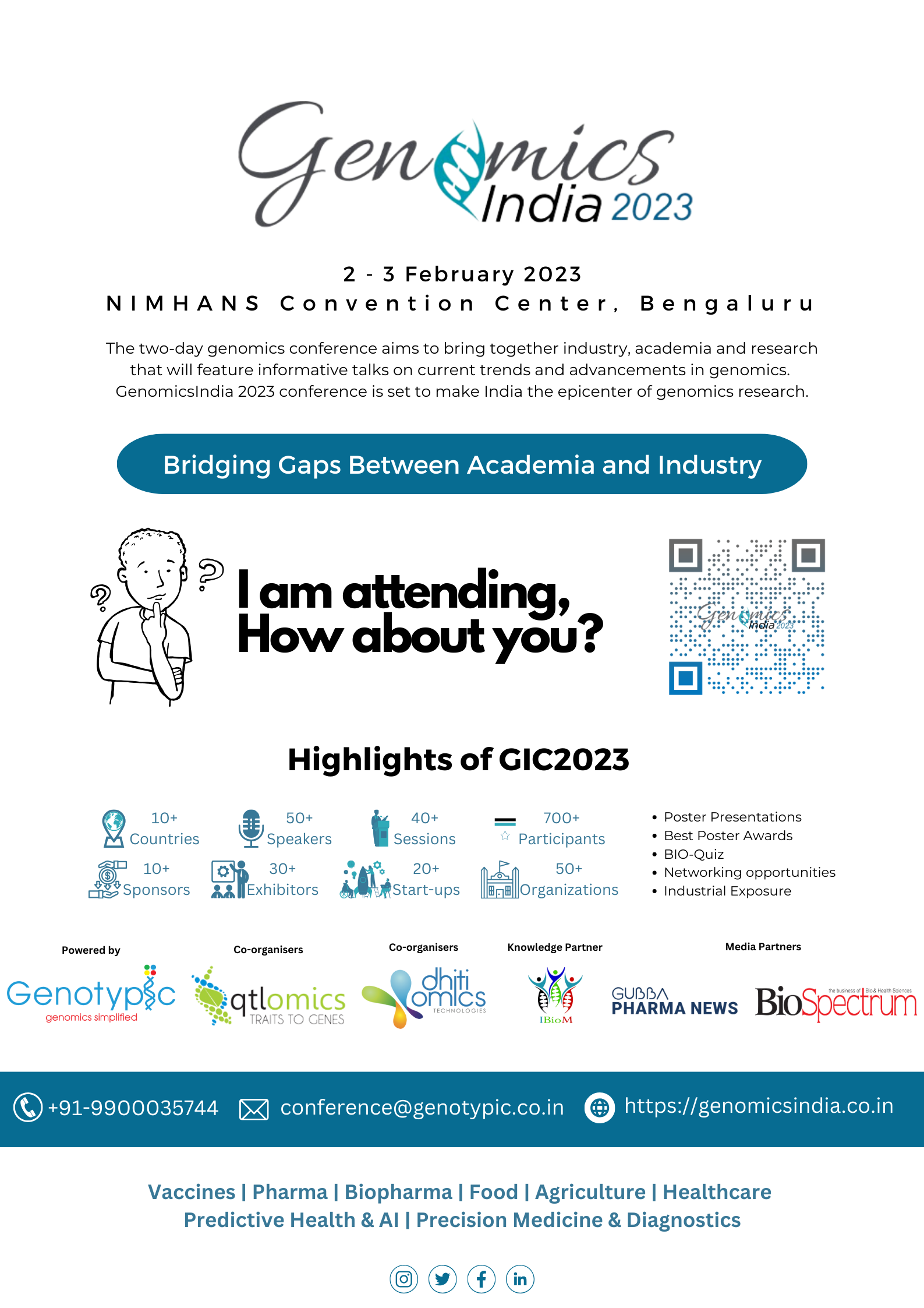 India’s premier biotechnology event, Genomics India 2023 Conference, held on 2-3 February 2023 at NIMHANS Convention Center, Bengaluru. The conference showcases the latest developments and applications of Genomics in Food, Agriculture, Healthcare, Biopharma, Vaccines, precision, and predictive Medicine, and the Environment. Bringing together the best minds from industry and academia across the world to discuss Genomics in India, the GIC 2023 is the most distinguished genomics event in India. Designed by leading experts to address the large-scale genomics needs of the country GIC 2023 can provide you a platform for discussion.